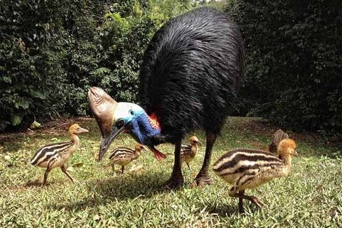 Esta ave no voladora de Nueva Guinea y el noreste de Australia puede alcanzar una altura de 79 pulgadas. Estructuralmente, parece un cruce de pavo y avestruz, y su coloración brillante los hace parecerse hasta cierto punto a un pavo real. Su cuerpo tiene plumas negras. Su cabeza es azulada y el cuello es rojo, pero lo más sorprendente es que estos colores pueden cambiar según el estado de ánimo del ave.