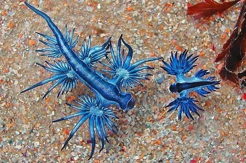 El dragón azul es una babosa de mar de un tamaño diminuto (unos 3 cm). Este hermoso animal a menudo se conoce con razón como un ángel marino. Su cuerpo ahusado es de color gris plateado dorsalmente y azul pálido ventralmente, con rayas azul oscuro en la cabeza. Tiene seis respuestas que se irradian en ceratas en forma de dedos y una cola puntiaguda. Se alimenta de hidrozoos; Incluyendo la criatura parecida a una medusa altamente venenosa llamada Carabela portuguesa. Se protege de ser dañado produciendo moco y guarda el veneno de su presa en los ceratas para usar con fines defensivos. De hecho, este veneno es más dañino que su forma original, ya que el dragón azul lo mantiene concentrado.