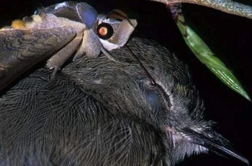 Todas las noches, esta polilla de Madagascar se acerca sigilosamente a las aves dormidas y extiende su espeluznante probóscide, un sueño oral con forma de arpón con una punta cubierta de púas, deslizándola debajo de los párpados de las aves donde el gancho se traba en su lugar. Cuando las púas de la probóscide entran en contacto con los ojos, la irritación provoca la liberación de lágrimas que la polilla bebe con alegría. Se ha observado que estas polillas se adhieren al cuello de las aves y les chupan los ojos durante 35 minutos, mientras que las aves no muestran signos de perturbación, lo cual es bastante sorprendente.
