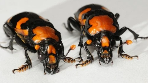 Estos escarabajos son los sepultureros del mundo de los insectos, sepultureros a los que les encanta comer la carne apestosa de animales muertos y en exhibición. Se pueden encontrar en todo el mundo y se alimentan de los cadáveres de pequeños mamíferos y aves. Sus antenas pueden captar el olor de los cadáveres desde largas distancias, generalmente dentro de una hora de la muerte de los animales. Y los escarabajos tienen que llegar rápido al sitio, o de lo contrario perderán el premio ante alguna otra criatura amante de la carroña, como un cuervo o incluso otro escarabajo enterrador. Si dos o más escarabajos enterradores se topan con el mismo cadáver, lucharán por los derechos de carroñero, y el ganador será el escarabajo más grande.