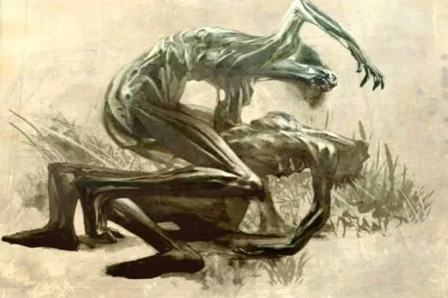 En el budismo japonés, Jikininki o “fantasmas devoradores de humanos”, son los espíritus de personas codiciosas, egoístas o impías que fueron maldecidas después de la muerte para comer cadáveres humanos. Por lo tanto, pasan las noches buscando cadáveres nuevos y ofrendas de comida para los muertos. A veces, Jikininki también roba cadáveres en busca de objetos de valor que luego usan para sobornar a los funcionarios locales para que los dejen en paz.