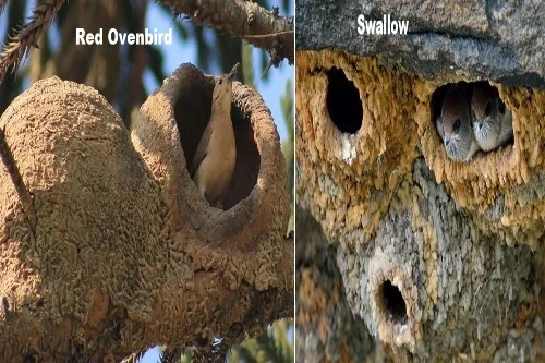 El hornero rufo o hornero rojo utiliza barro o estiércol como material principal para construir tazones de barro, construidos sobre ramas altas de árboles, postes, postes, etc., donde el sol los cuece, creando un refugio resistente donde yacían las aves. huevos. Los nidos están de espaldas a los vientos dominantes. Por lo tanto, estos son perfectos para la incubación de huevos y son un hogar para los polluelos y sus padres en todo tipo de clima. Muchas especies de golondrinas también construyen nidos de barro. Los nidos de golondrina también se pueden hacer con la saliva de las aves. Estos nidos, construidos en colonias, son considerados un manjar por algunas personas. Se cree que la evolución de la construcción de nidos está asociada con el tamaño de puesta en marcha de una especie de golondrina.