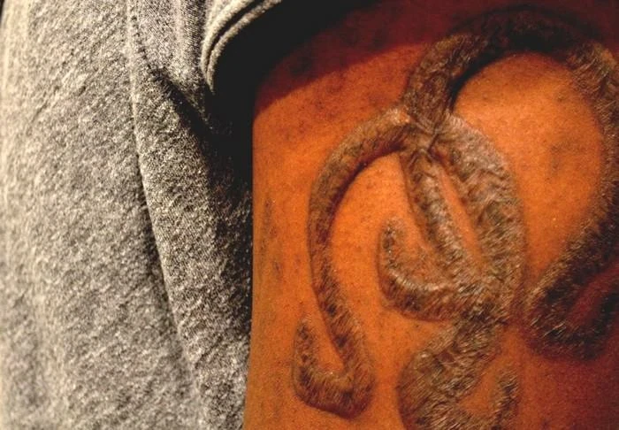 La evidencia arqueológica mostró que la escarificación, el acto de hacer cicatrices deliberadamente en nuestra piel al desollar (cortar la piel y quitarla), abrasión (frotar tinta, agentes químicos u otras cosas) para obtener los diseños deseados, fue utilizada 8000 aC Una estatua de la diosa de la fertilidad fue encontrada en Ain Ghazal, en Jordania, con profundos signos de escarificación alrededor de las nalgas y el abdomen.