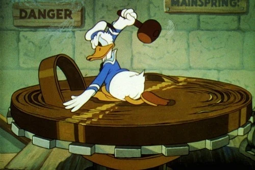 En la película Clock Cleaners, estrenada en 1937, el pato Donald, junto con Mickey Mouse y Goofy, trabaja como conserje en una alta torre de reloj. Mientras que Mickey y Goofy se enfrentan a sus propios desafíos en el trabajo, Donald se ve atrapado en un recurso principal del reloj bastante discutidor y combativo cuando su fregona queda atrapada y se suelta. Intenta volver a colocarlo con un mazo. Después de una larga pelea y pelea con el resort, se atasca en un engranaje en el eje del volante, donde sus amigos pronto se unen a él.