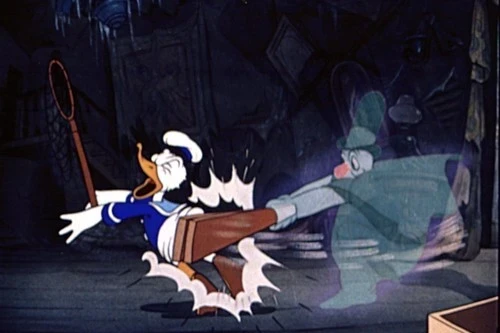 En la película de dibujos animados de 1937, Lonesome Ghosts, el pato Donald asume el papel de cazafantasmas. Se contrata a los exterminadores de fantasmas de Ajax para expulsar a los fantasmas de una casa embrujada. Los propios fantasmas hacen la llamada y gastan bromas molestan a Donald, Mickey y Goofy cuando llegan. Donald es golpeado con una tabla de madera y se asusta con sonidos extraños. Los tres terminaron cubiertos de melaza y harina, y accidentalmente ahuyentan a los fantasmas, dejando a Donald sintiéndose bastante satisfecho.