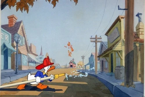 En la película de 1940, Jefe de Bomberos, el Pato Donald asume el papel de un jefe de bomberos que, con sus sobrinos, Louie, Dewey y Huey, se encargan de la estación de bomberos. Donald ronca, para disgusto de sus sobrinos, quienes tocan la alarma. Pronto, el edificio de la estación se incendia por su torpeza, y el trío nervioso, sin darse cuenta de que ya están en el destino, suena la alarma. No pueden hacer frente y sus esfuerzos van cuesta abajo, ya que el edificio se incendia.