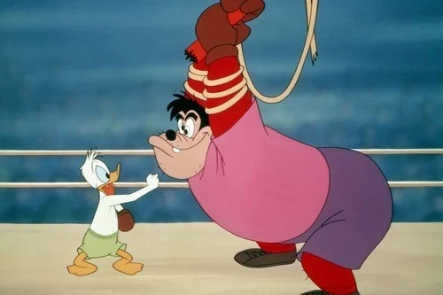En la película de 1953, Canvas Back Duck, se engaña a Donald para que participe en un combate de boxeo con Pegleg Pete, un matón agresivo y enorme, mientras Donald visitaba un carnaval con sus sobrinos, Huey, Dewey y Louie. La situación se le va de las manos durante el partido, a pesar de la ayuda de sus sobrinos, pero pronto, accidentalmente le da un puñetazo en la mandíbula a Pete. Resulta que la mandíbula de Pete estaba hecha de vidrio y se desmorona, y Donald sale victorioso.