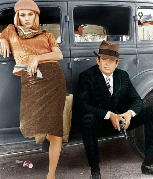 El director Arthur Penn capturó su legado en esta película galardonada e increíblemente violenta (para la época) de 1967, Bonnie and Clyde. La moda de las estrellas Warren Beatty y Faye Dunaway, que interpretan a los respectivos forajidos, refleja la desesperación de una nación que intenta aferrarse a su dignidad. Beatty viste trajes de tres piezas oscuros y de colores monótonos, que son a la vez elegantes y siniestros. Duanway, por otro lado, se destaca con sus elegantes vestidos, su omnipresente boina y, en un momento, su icónico suéter amarillo.