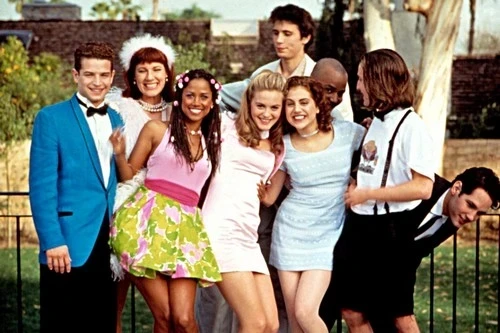 Esta actitud es especialmente prominente en Clueless, la película de 1995 protagonizada por Alicia Silverstone en su papel principal. La película, ambientada en una escuela secundaria del sur de California, presenta muchas modas dispares entre las camarillas, pero todas son claramente de los 90 con su negación compartida de una estética común. Silverstone y sus amigas preppy usan ropa de diseñador, reutilizada para parecerse a la ropa tradicional de la escuela. Por otro lado, la camarilla skater viste jeans rasgados y franela como un guiño a la era grunge.