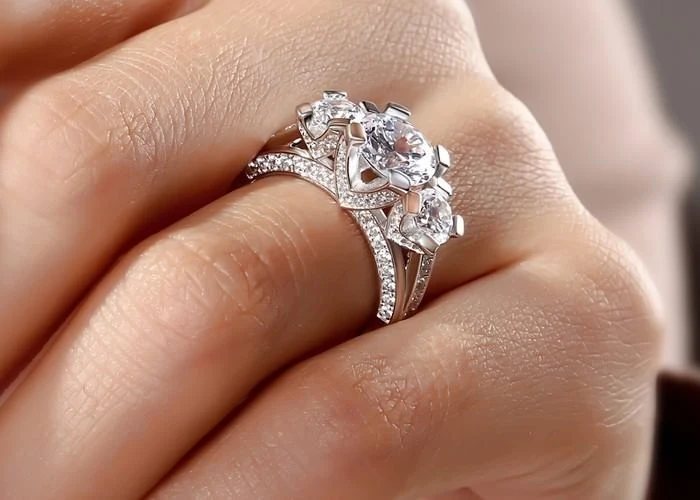 Di tu te amo multiplicado por tres con un anillo de compromiso clásico de tres piedras. Si bien son más caros que los solitarios, son increíblemente únicos y pueden simbolizar su pasado, presente y futuro con su futura novia.