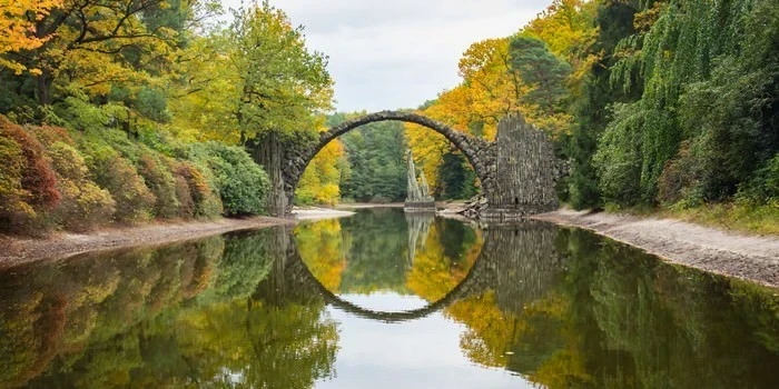 El puente Rakotzbruck se construyó hace aproximadamente 150 años, en 1860. Su ilusión óptica hace que el puente y su reflejo se fusionen en un círculo perfecto. Definitivamente es el puente más hermoso de Alemania. Sin embargo, está prohibido cruzar el puente, pero puedes verlo caminando en el Parque Kromlau.